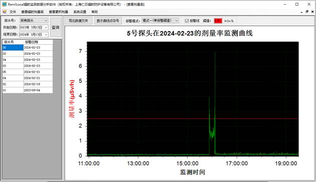 6、數據分析:免費提供功能強大的RenLocal輻射監測數據分析軟件,可通過曲線和棒狀圖的形式分析歷史劑量率和累積劑量數據以及實時查詢報警數據與統計分析等